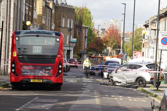 First pictures from the scene of a shooting in Brixton show a crashed silver Land Rover and a motorbike alongside rubble in the road.